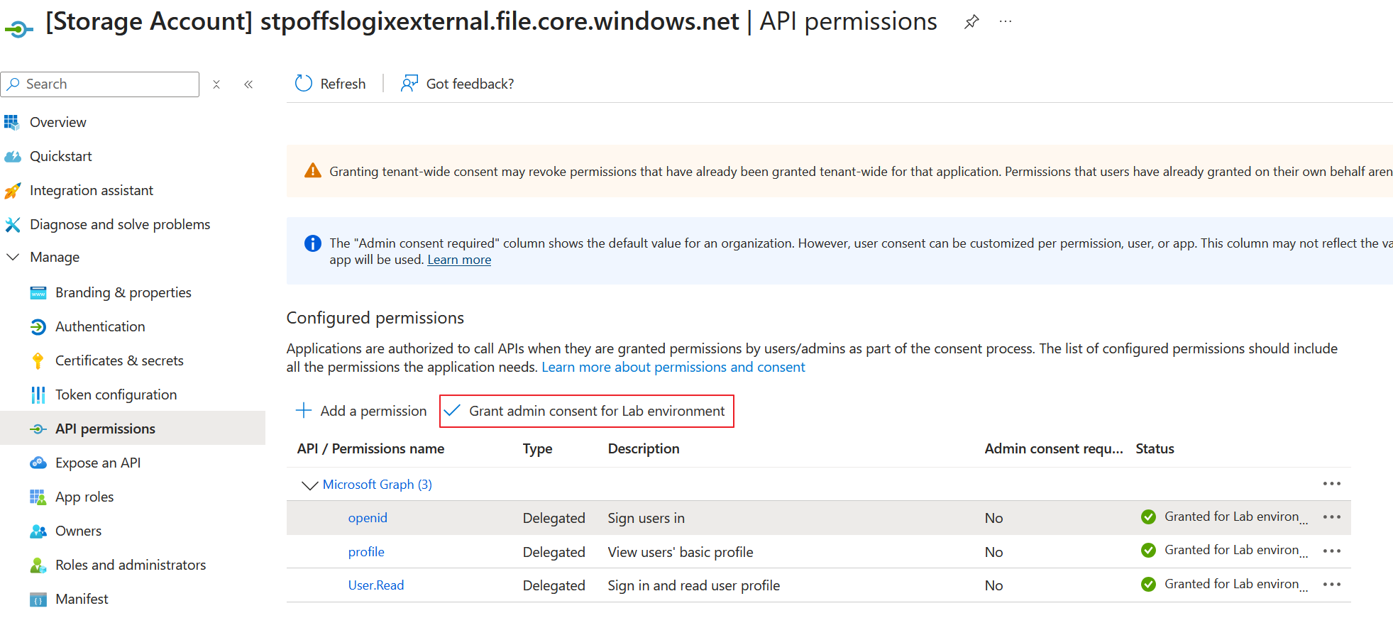 The app registrion needs to have a couple of api permissions to give the identiy access to the file share, in this scenario you need to grant consent to openid, profile, and User.Read for all accounts in the directory.