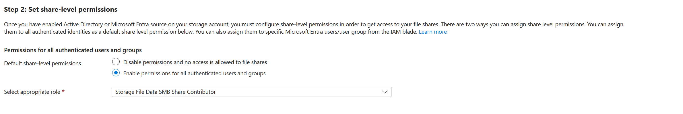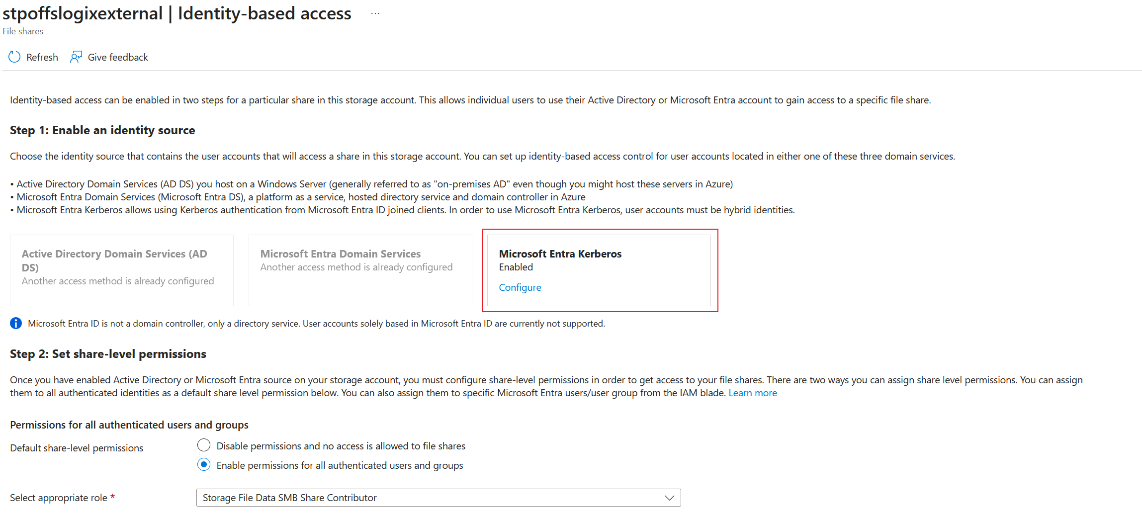 When the storage account is deployed the file share is created you can set up the "Microsoft Entra Kerberos" authentication. This can be found under the storage account -> file share below the file share settings, you will see the "not configured" clickable link: