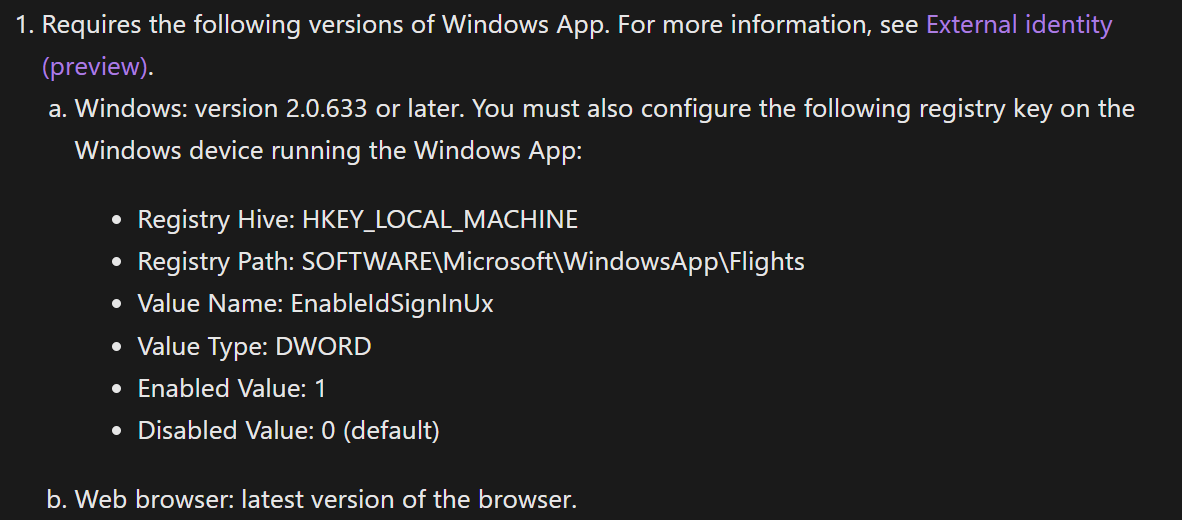 Set-ItemProperty -Path "HKLM:\SOFTWARE\Microsoft\WindowsApp\Flights" -Name "EnableIdSignInUx" -Value 1 -Type DWord