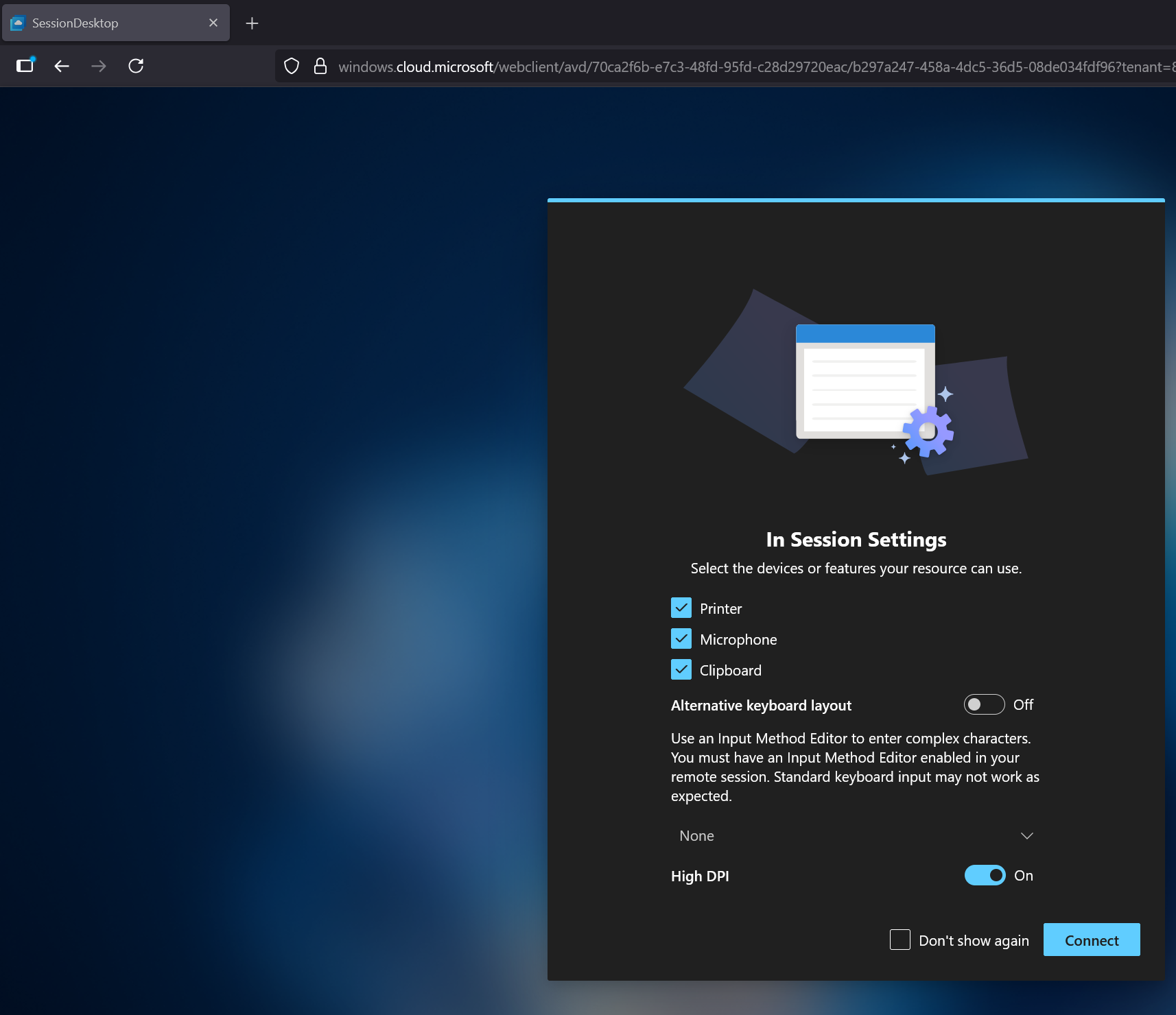 - When you use the URL you will see that it connects to the Azure Virtual Desktop: