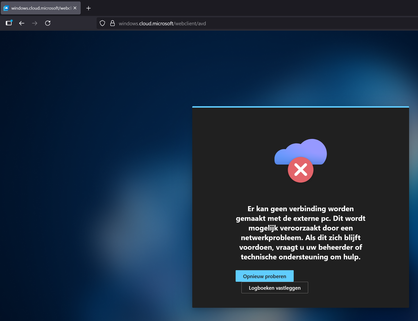 When I try it now with a browser and go to https://windows.cloud.microsoft/webclient/avd and try to log in, using the dummy guest account, I will not see a desktop and will receive the almost the same error message: